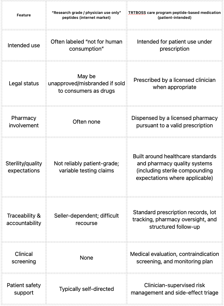 This article explains the practical, legal, and safety differences between (1) buying “research grade / physician use only” peptides on the internet and (2) receiving peptide-based medication within a TRTBOSS care program, where a licensed clinician evaluates eligibility, prescribes when appropriate, and a licensed pharmacy dispenses medication intended for patient use.