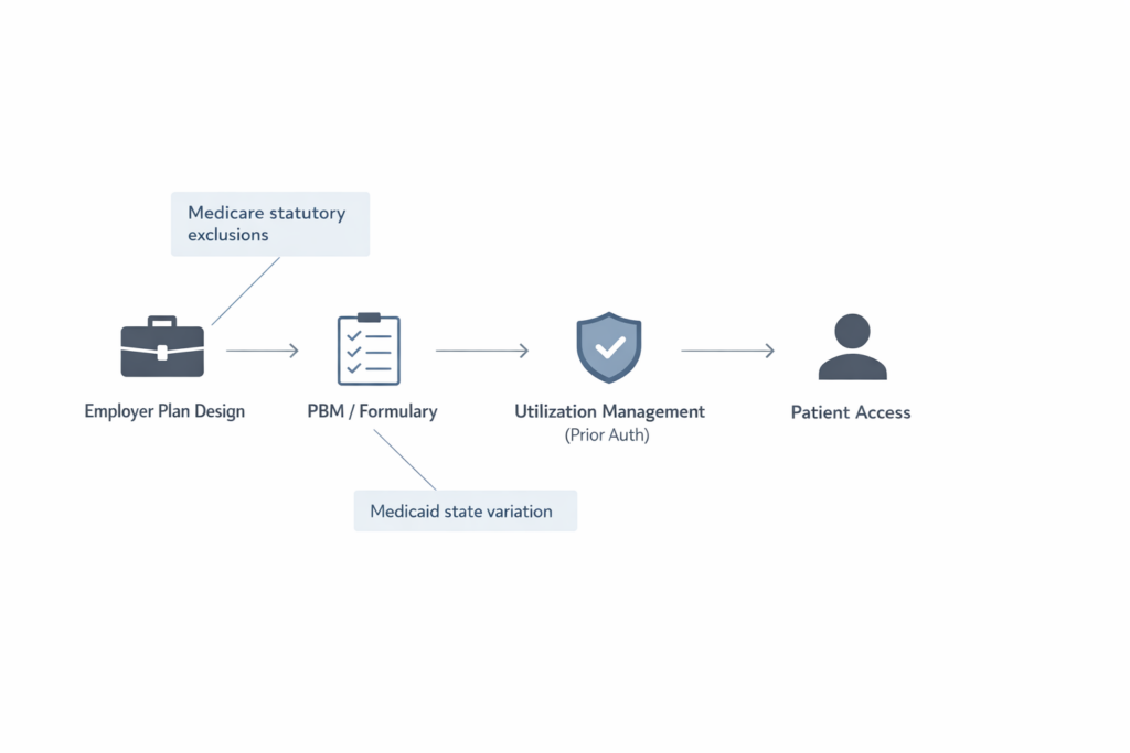 This is not simply a paperwork problem. Coverage decisions for weight management medications are shaped by federal statutes, employer benefit design, pharmacy benefit manager (PBM) rules, utilization management (like prior authorization), and budget impact concerns, especially for medications with high monthly costs and rapidly rising demand.
